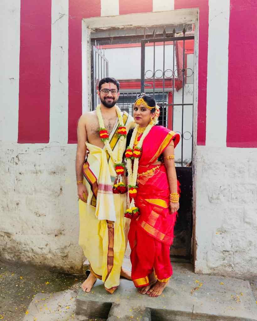 My dad and mom arranged the backdrop for the stage (the stage curtain, our name boards, the sheet underneath). They got those on rent from Madurai. They washed it before bringing it. My sister did the mehendi for me. We arranged for a flower guy to buy all the garlands a day before and sanitised them before using. this was we cut off a lot of outside contact.